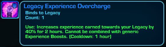 Use: Increases experience earned towards your Legacy by 40% for 2 hours. Cannot be combined with generic Experience Boosts. (Cooldown: 1 hour)