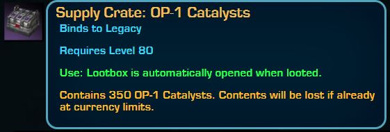 Requires Level 80 and Bound to Legacy: Contains 350 OP-1 Catalysts. All 350 OP-1 Catalysts are automatically looted the moment you RIGHT CLICK on the box.