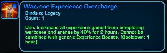 Use: Increases all experience gained from completing warzones and arenas by 40% for 2 hours. Cannot be combined with generic Experience Boosts. (Cooldown: 1 hour)