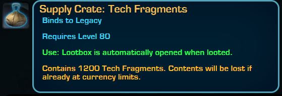 Requires Level 80 and Bound to Legacy: Contains 1200 Tech Fragments. All 1200 Tech Frags are automatically looted the moment you RIGHT CLICK on the box.