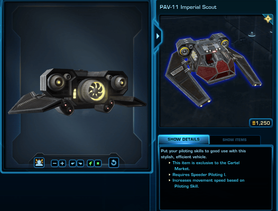 Aratech S15 Scout Speeder Bike – An account wide, unlocked Speeder Bike with unique flourish animation that can be equipped by all players Level 1 or higher, even if you do not own the Speeder Piloting skill!