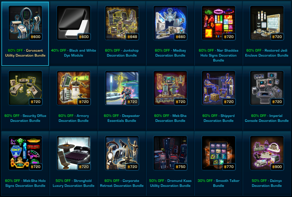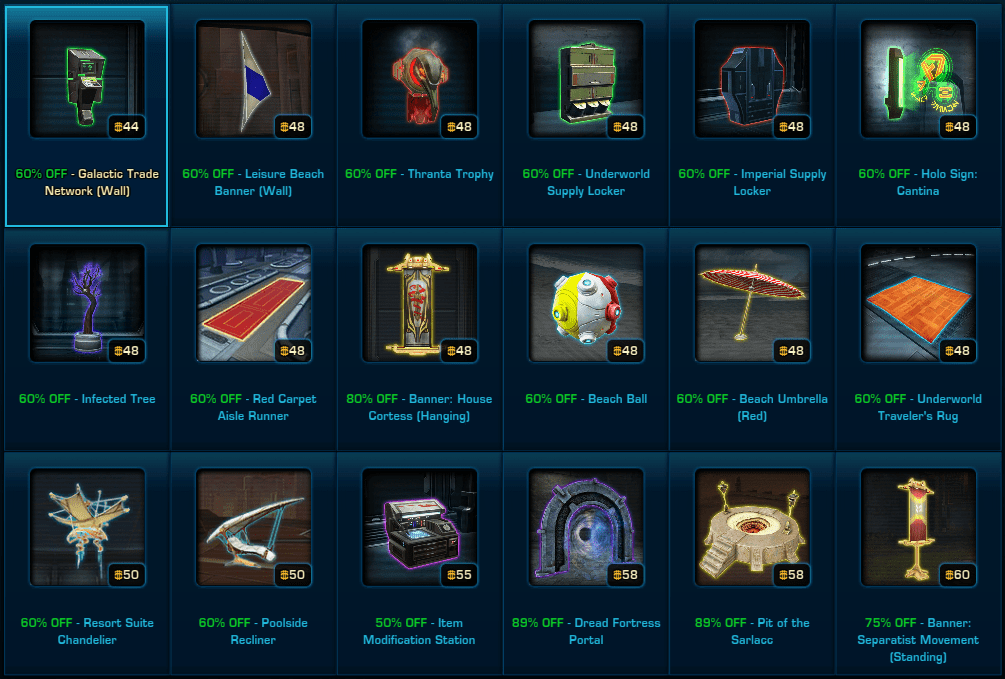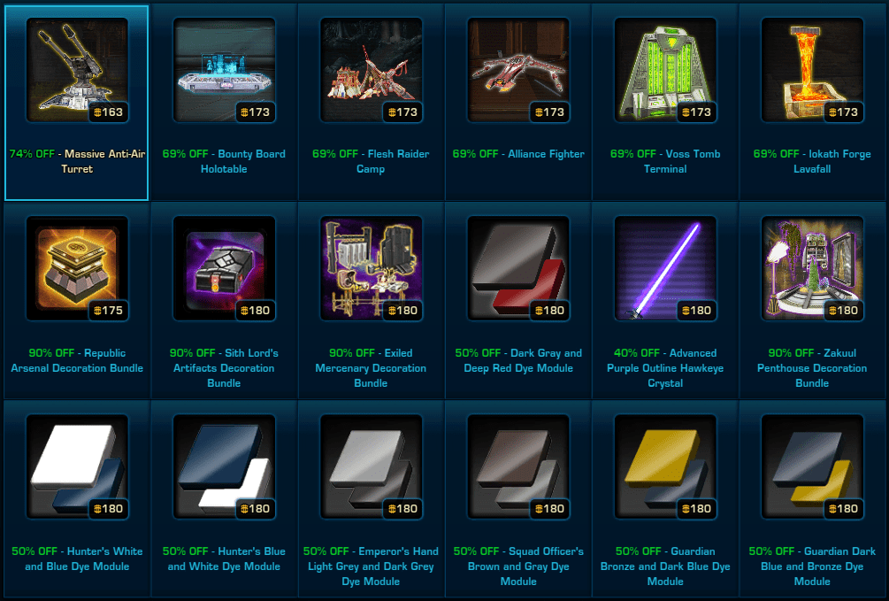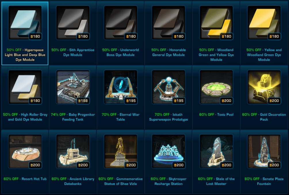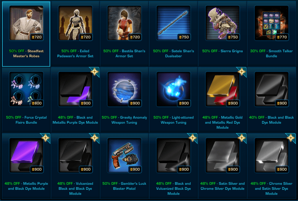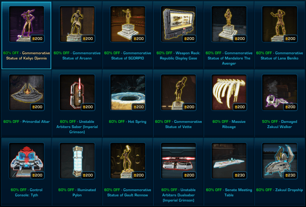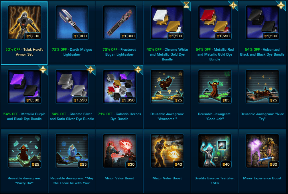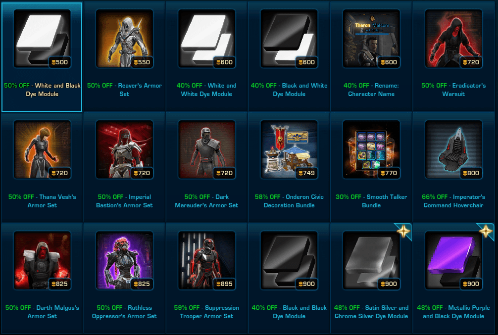Every special available in the SWTOR Sale on the Cartel Market in game on November 2025.