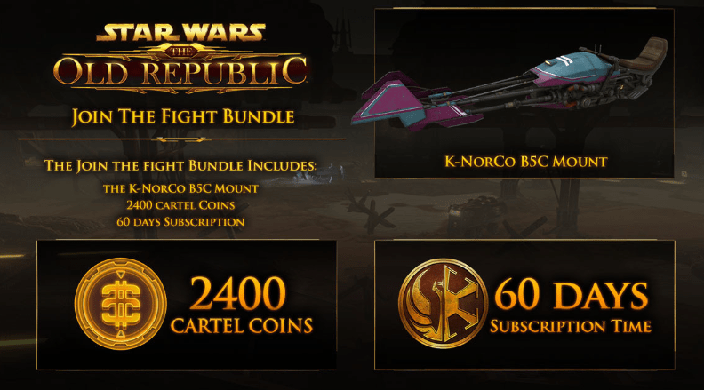 The STAR WARS: The Old Republic – Continue the Fight Bundle is a limited time offer to new and existing players in SWTOR, for a little above the price of a Non-Recurring 60 Day Subscription timecard the bundle includes 60 days of subscription, 2400 Cartel Coins and the K-NorCo D3M Mount which can be used at Level 1, without the Speeder Piloting Skill!