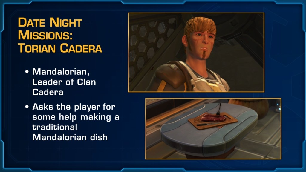 Kira Carsen and Torian Cadera will feature as two Date Nights (repeatable, free quests) to players that have romanced Torian and Kira. These two date night quests will most likely require completion of KOTFE and reward free titles and decorations for eligible players that romanced Kira or Torian in the Alliance Alerts interface.