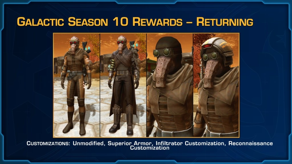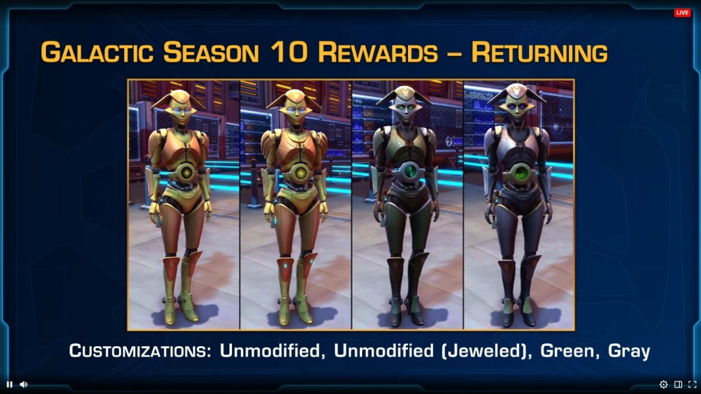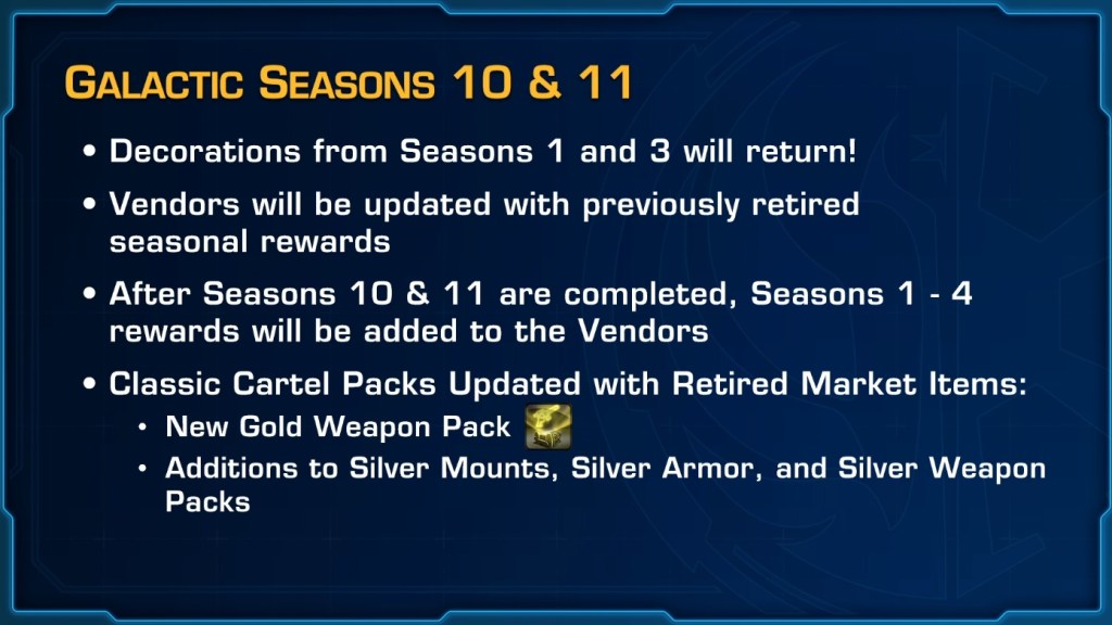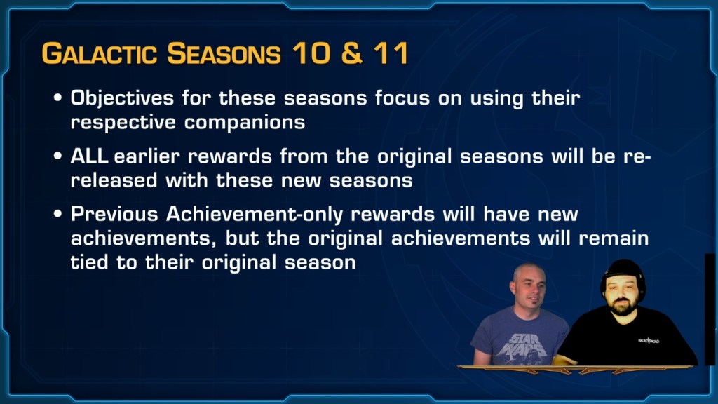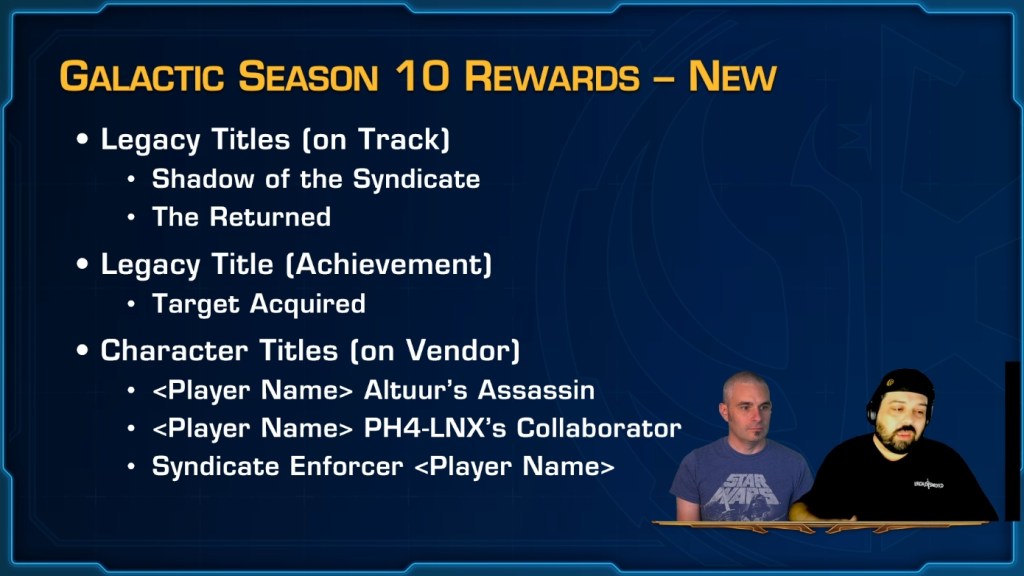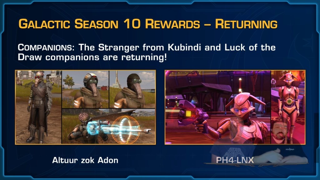 SWTOR’s newest Galactic Season 10: Secrets of the Syndicate, will be the first season to return Achievements and Rewards from Galactic Season 1 and 3, including companions Altuur Zok Adon and PH4-LNX as well as brand new rewards and meta achievements!
