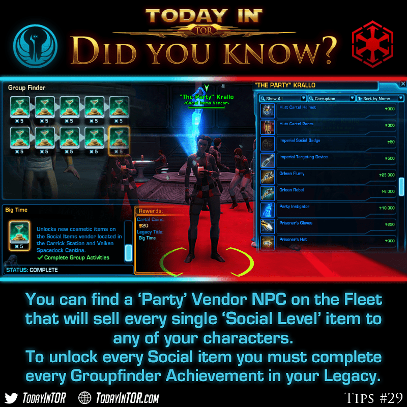 Did You Know #57 – Social Level Items July 8, 2022March 28, 2023 / todayintor / Leave a comment Click to read how you can make the most of SWTOR’s new Social Rewards systemShare this: Click to share on X (Opens in new window) X Click to share on Facebook (Opens in new window) Facebook Like Loading...
